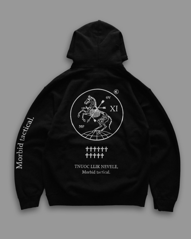 2026WS #12 "午SKULL COLT" Hoodie BLKxWHT 昨年の2025年からなんとなく始まった干支シリーズ第二弾。 午年(うまどし)の跳ね馬をあの大手銃器メーカーのエンブレムからオマージュした2026年限定デザインです。昨年同様やはり一年間限定のデザインになるんじゃないかと思います。 ちなみにデザイナーは今年年男です。 裏面ライトフリース生地。柔らかくふんわりとした着心地。 サイズ感は日本サイズよりもゆったりめ。 Color : BLACK x WHITE 8.0oz 着丈(Length):M 71/L 74/XL 74 cm 身幅(Width):M 56/L 61/XL 65 cm 袖丈(Sleeve Length):M 62/L 62/XL 62 cm
